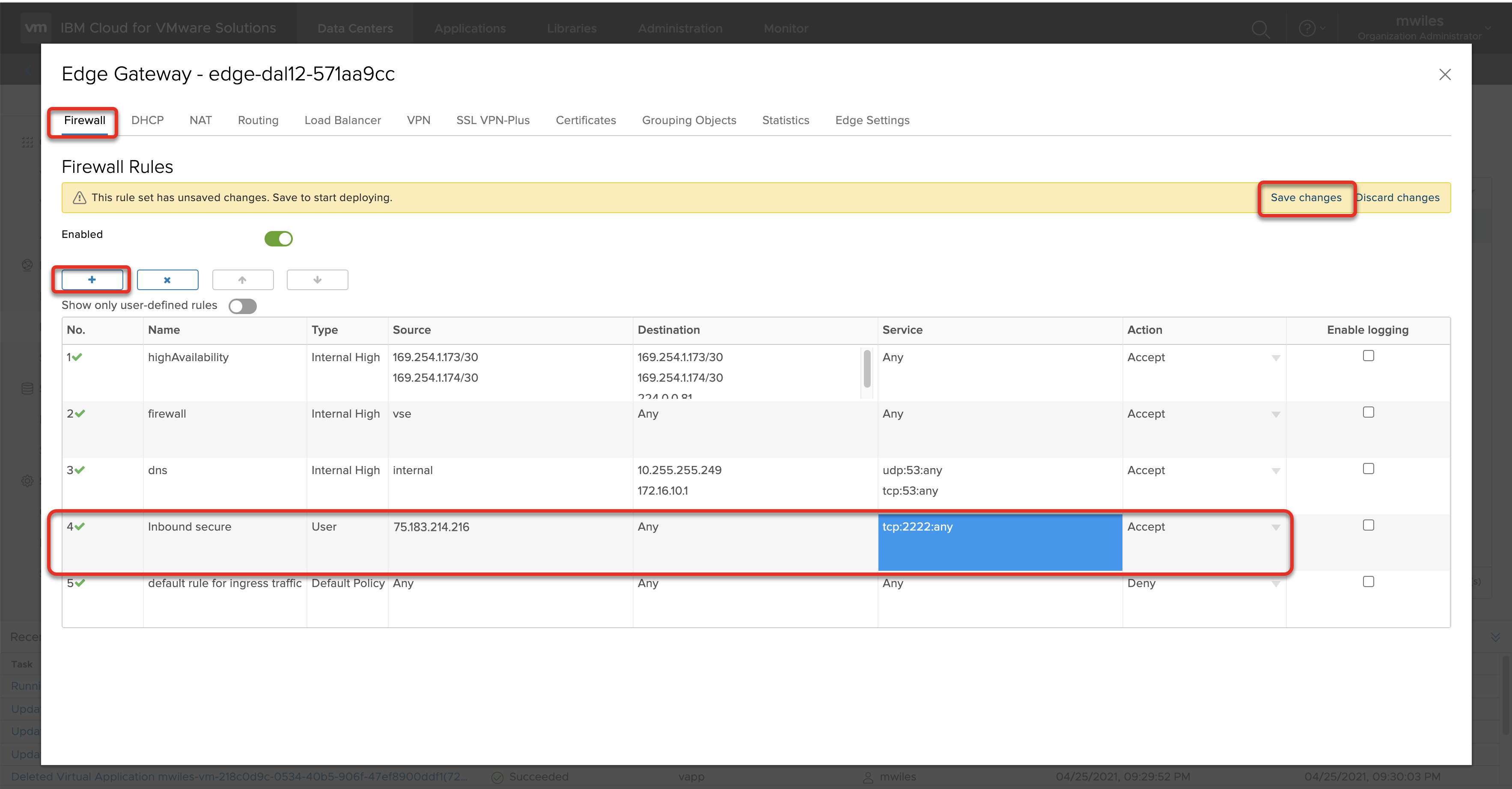 Create the ESG Firewall rule to allow the inbound traffic. In this case we are going to allow traffic from the Remote IP on Port 2222