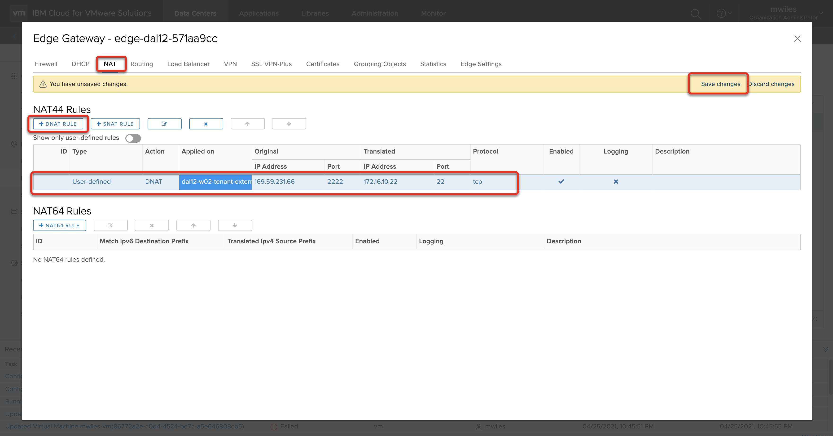 Create the ESG DNAT rule to change the destination of traffic from port 2222 on the external network to 22 on the internal network, select + DNAT button to add a new DNAT rule: