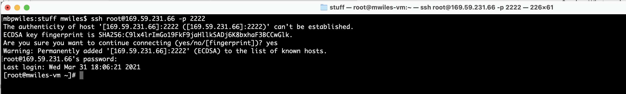 To test the rule, I will open a terminal on my local machine and try to ssh to the machine: