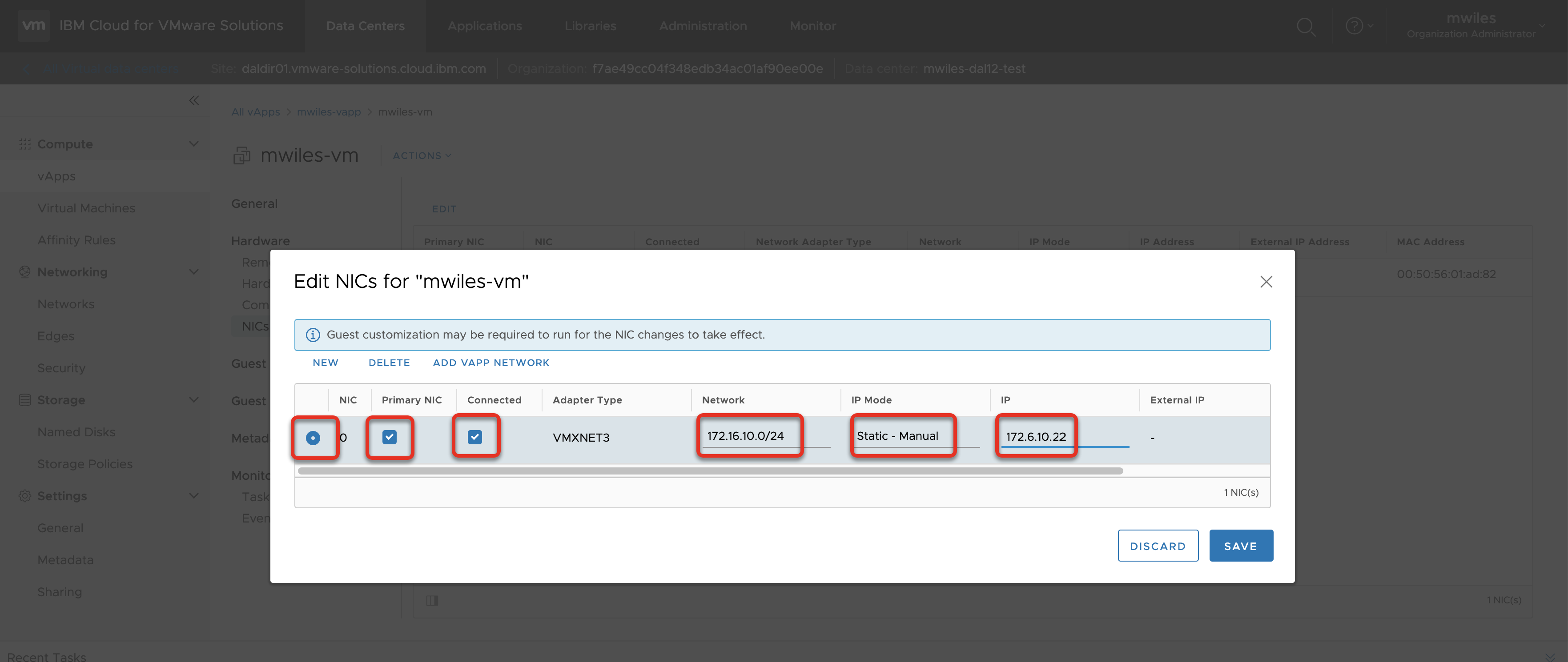 Compute > vApps > Virtual Machine > MACHINE > Hardware > NICs > Edit