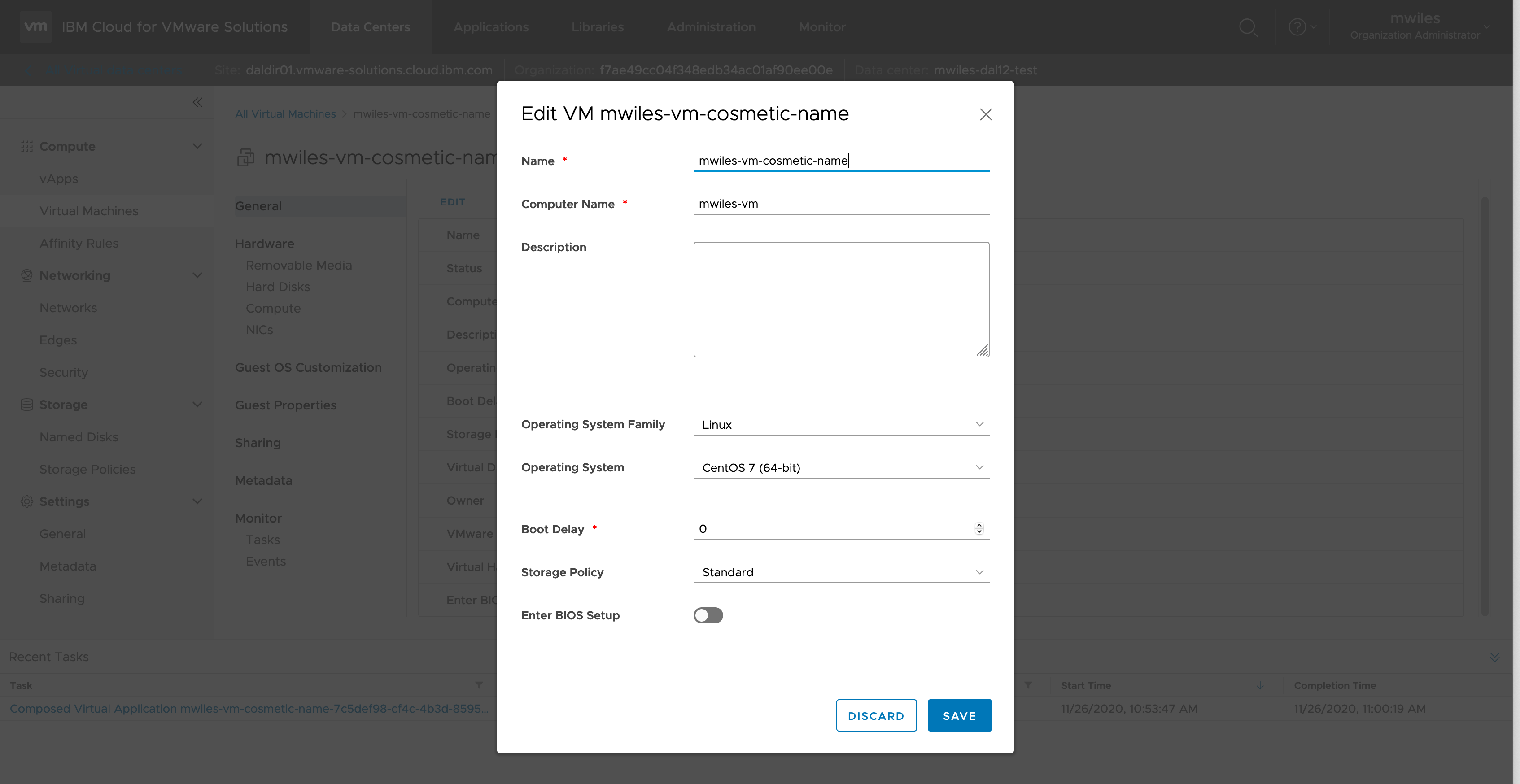- Operating System Family - in the case of this VM, Linux was set as part of the template. When creating a New VM (not from template) you are able to select which family. I read that vCenter Server (underlying infrastructure for vCD) chooses configuration defaults based on the guest type. Changing the guest operating system type after the virtual machine is created does not retroactively change those settings. It affects the recommendations and setting ranges offered after the change. From what I understand you might only change these if you are upgrading the guest operating system installed in the virtual machine.