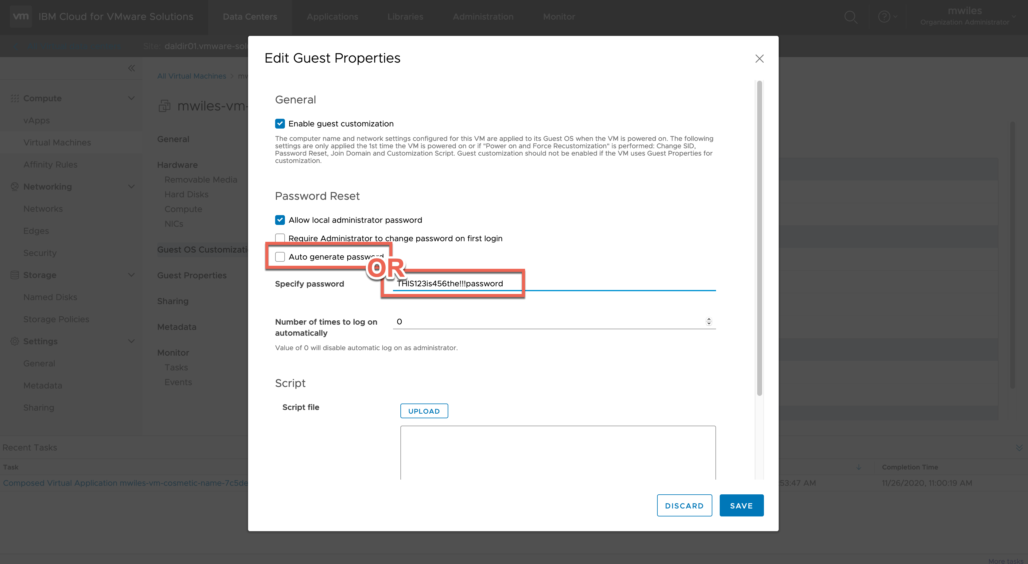 Compute > Virtual Machines > select VM > Guest OS Customization > EDIT Either use the auto generate option or specify password.