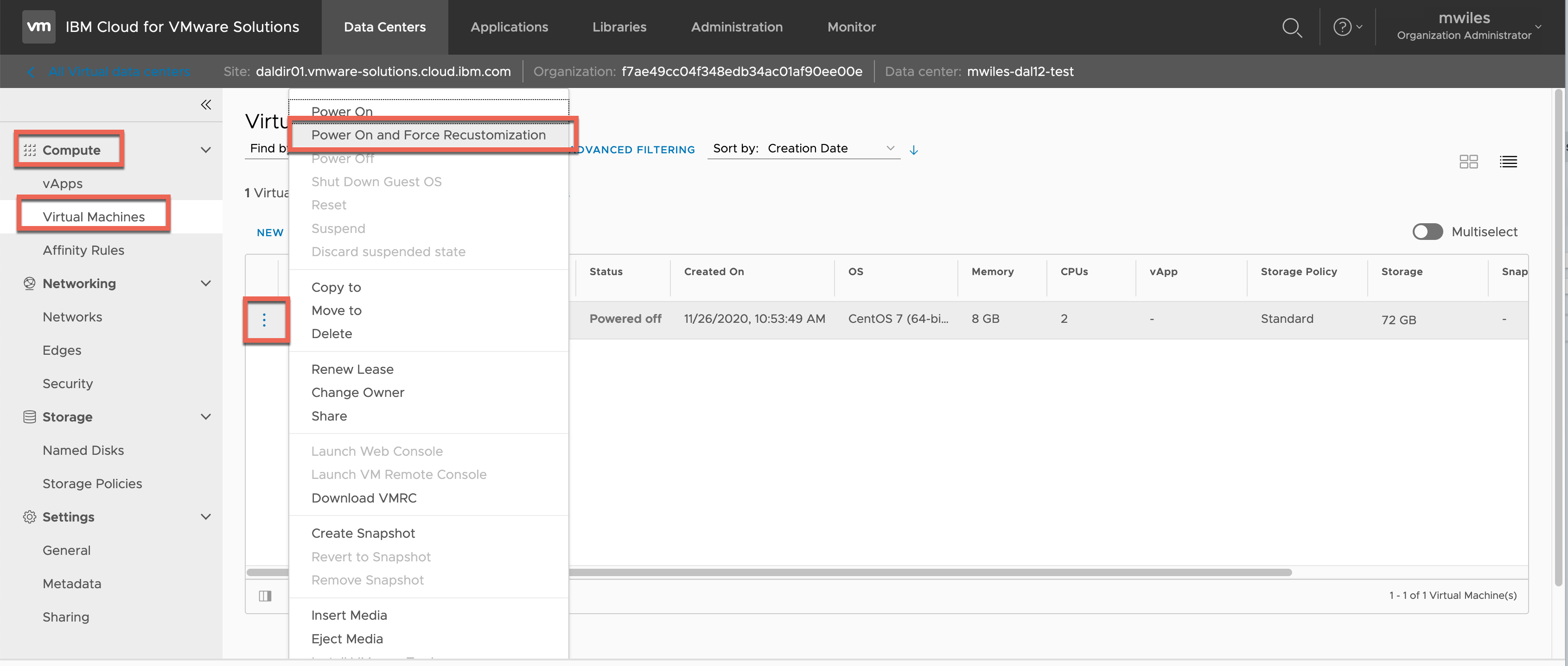 Compute > Virtual Machines > VM Menu > Power On and Force Recustomization