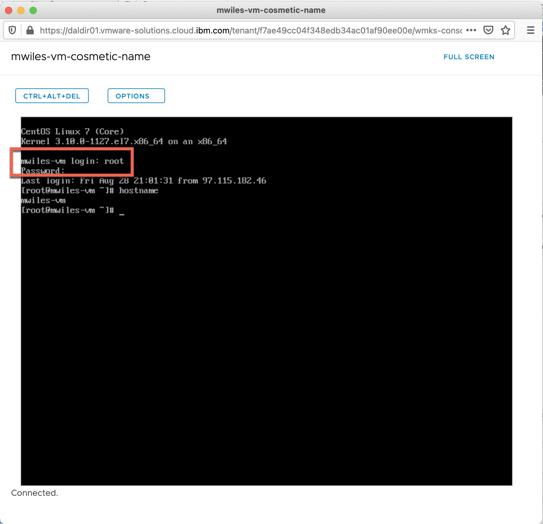 After the we console is launched and the VM it ready, login with the Admin (root / Administrator) user and password that was set in the OS Customization.