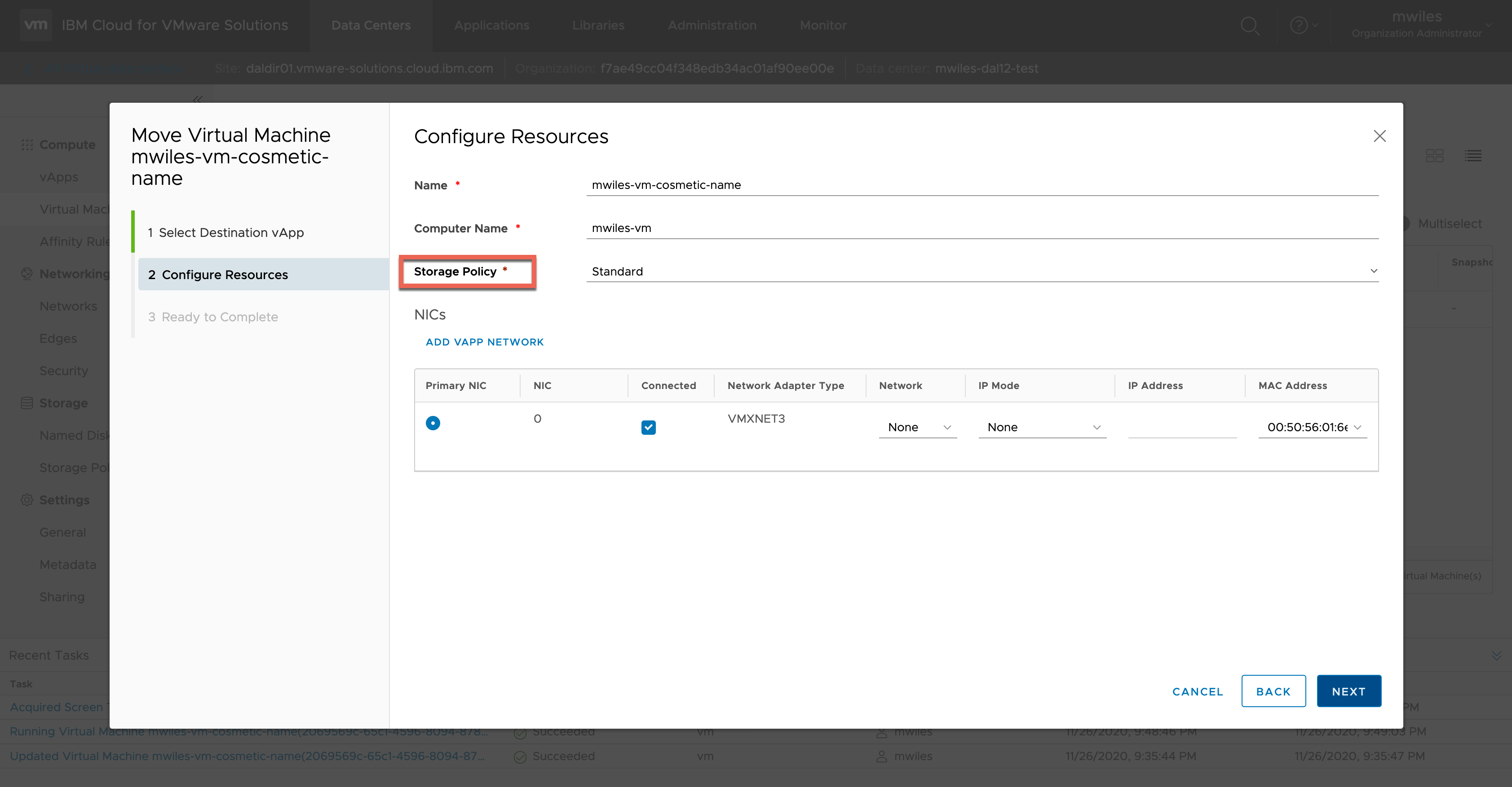 - Hard Disks - Properties of the Hard disk can be modified in this view. Most notably the Storage Policy can be changed. This will cause the virtual harddisk (.vmdk file) to be migrated to the new storage policy datastore and will take some time based on a number of variables (size of the harddrive, current storage policy, target storage policy, etc) .. please be patient when changing this property.