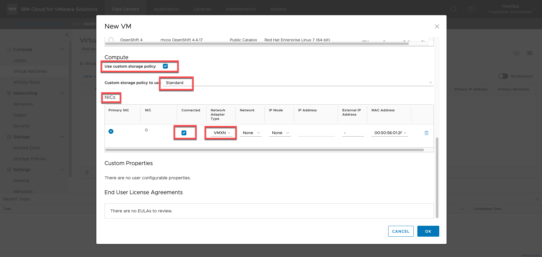 - Use custom storage policy - this allows you to determine which storage policy that the VM will use. VMs can be split across multiple storage policies which will be demonstrated in Customized VMs. For information about the different storage policies visit Storage overview. The default policy for VMs is currently set to Standard and that is what we will select in this demo.