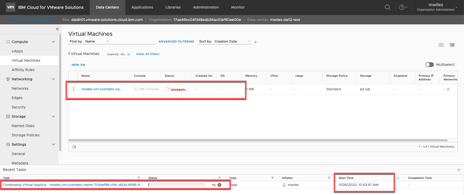 The first choice when deploying a VM in vCD is to consider using a Virtual Application (referred to a vApp) or create a ‘standalone’ VM. There are more advantages for using vApps then not. They are a relatively lightweight ‘container’ of VMs, networks, and some policies.